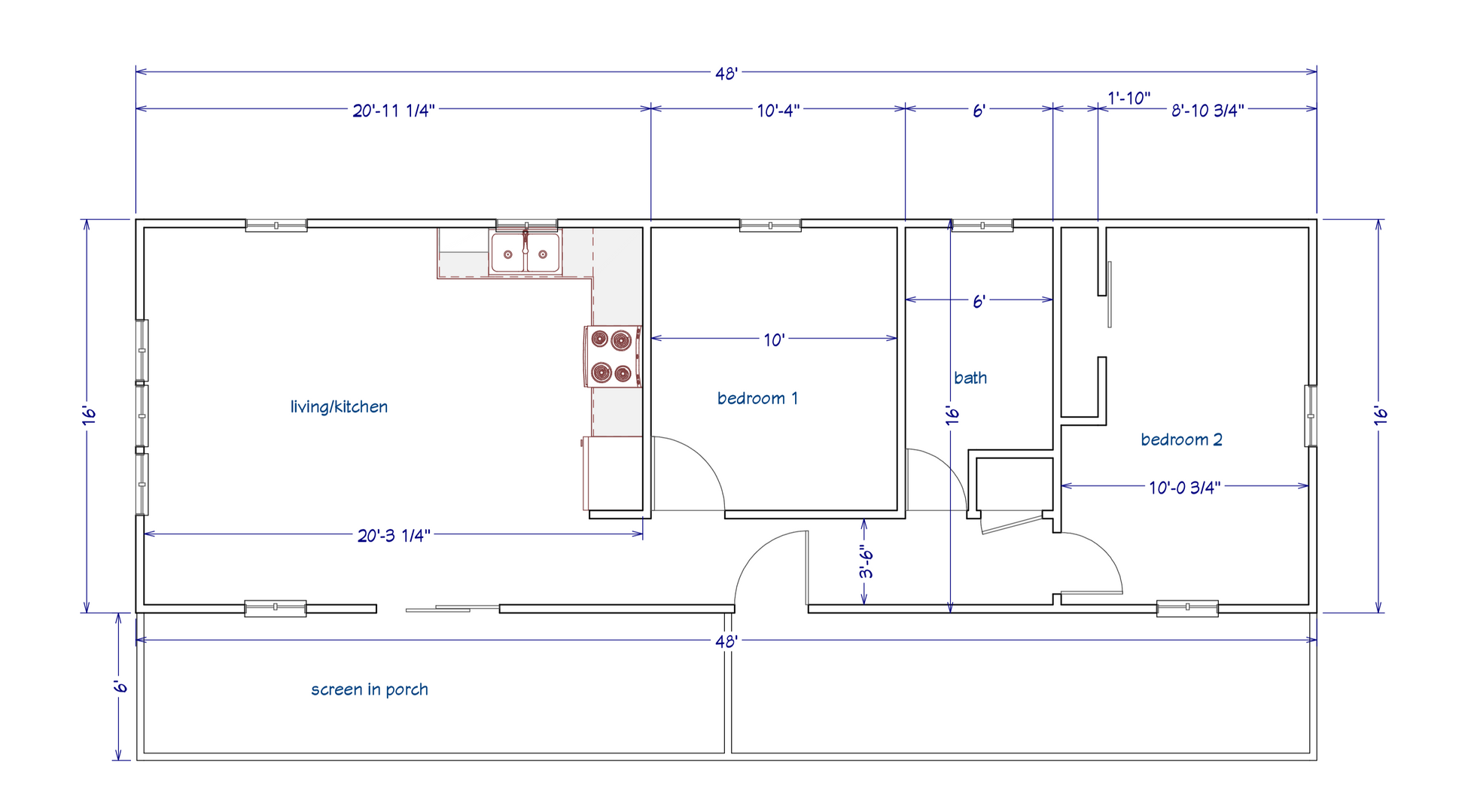 Welcome to Plan #204, our spacious 1-story ranch-style cabin featuring a smart 16' x 48' layout with 768 sq ft of living space—plus a beautiful 6’ x 48’ covered front porch perfect for relaxing, entertaining, or enjoying the view.