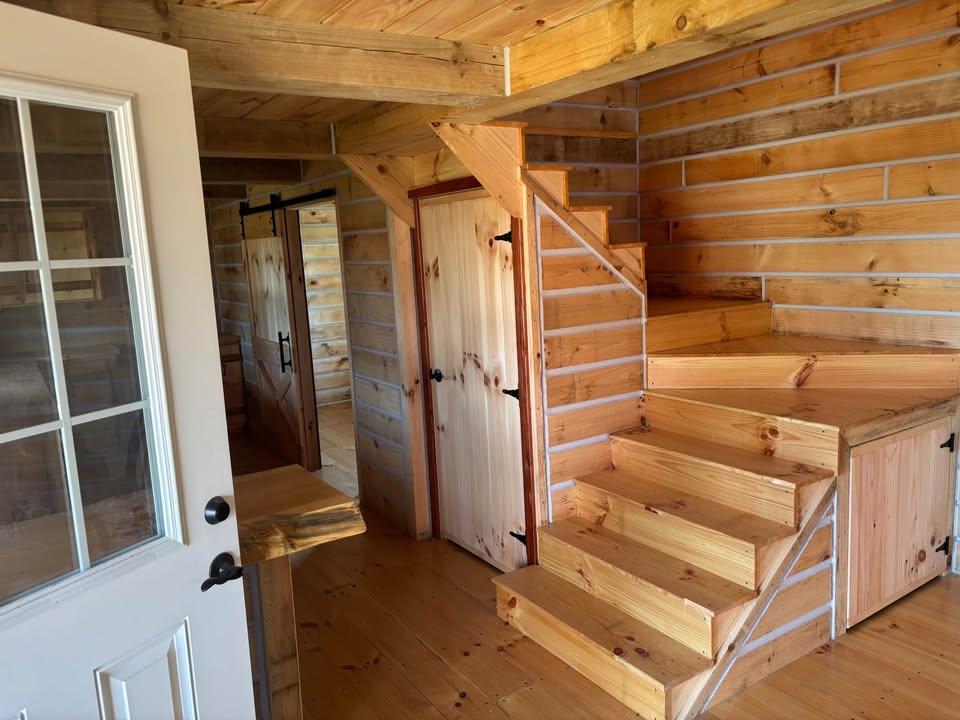 We’re excited to present the Big Bertha 2.0 Cabin, our newest and most versatile floor plan. This stunning cabin features three bedrooms and one bathroom, with a thoughtfully designed layout that includes one bedroom on the main floor and two charming lofted bedrooms upstairs.
