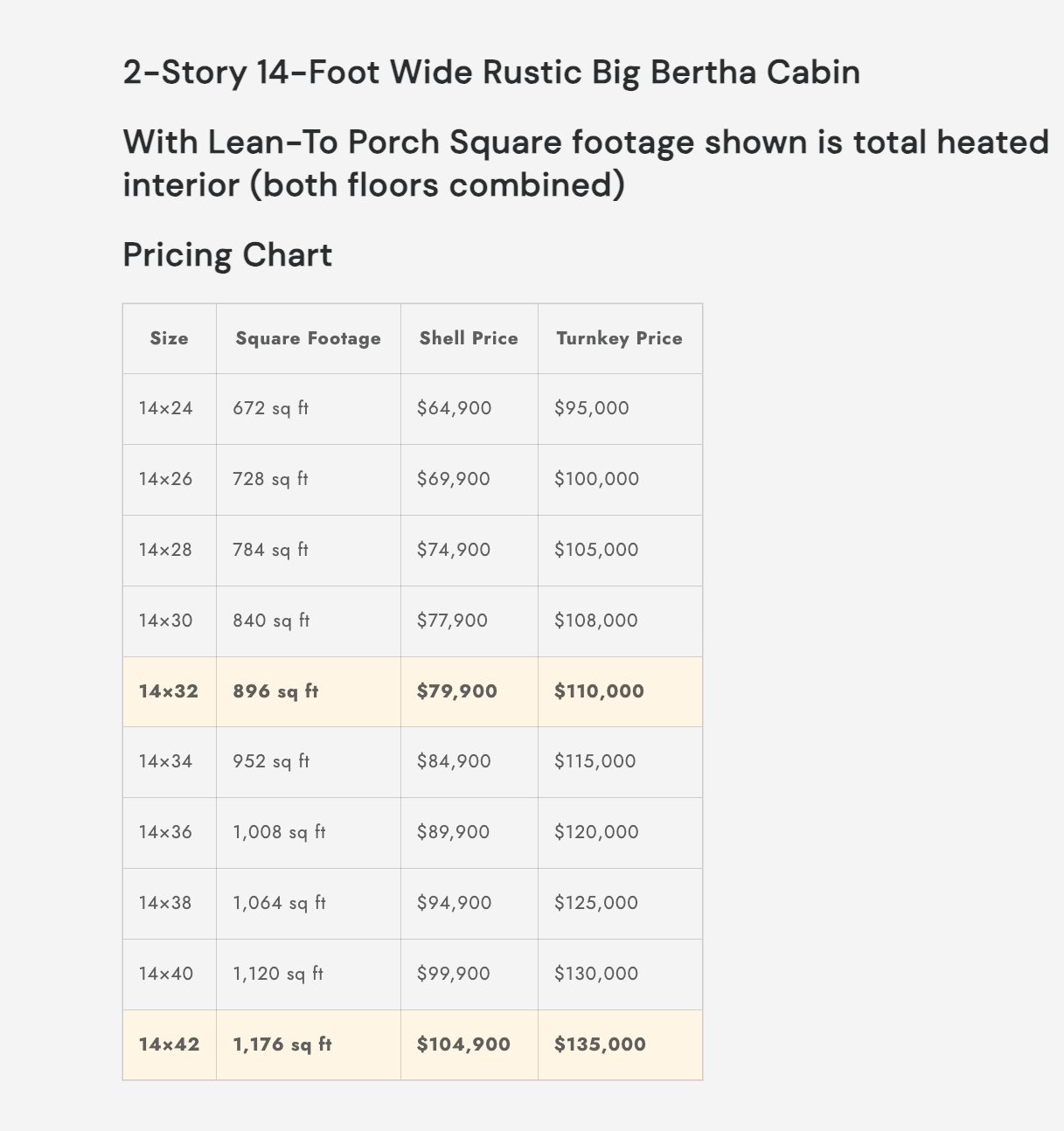 Shipping and installation costs are not included in the cabin prices shown below.