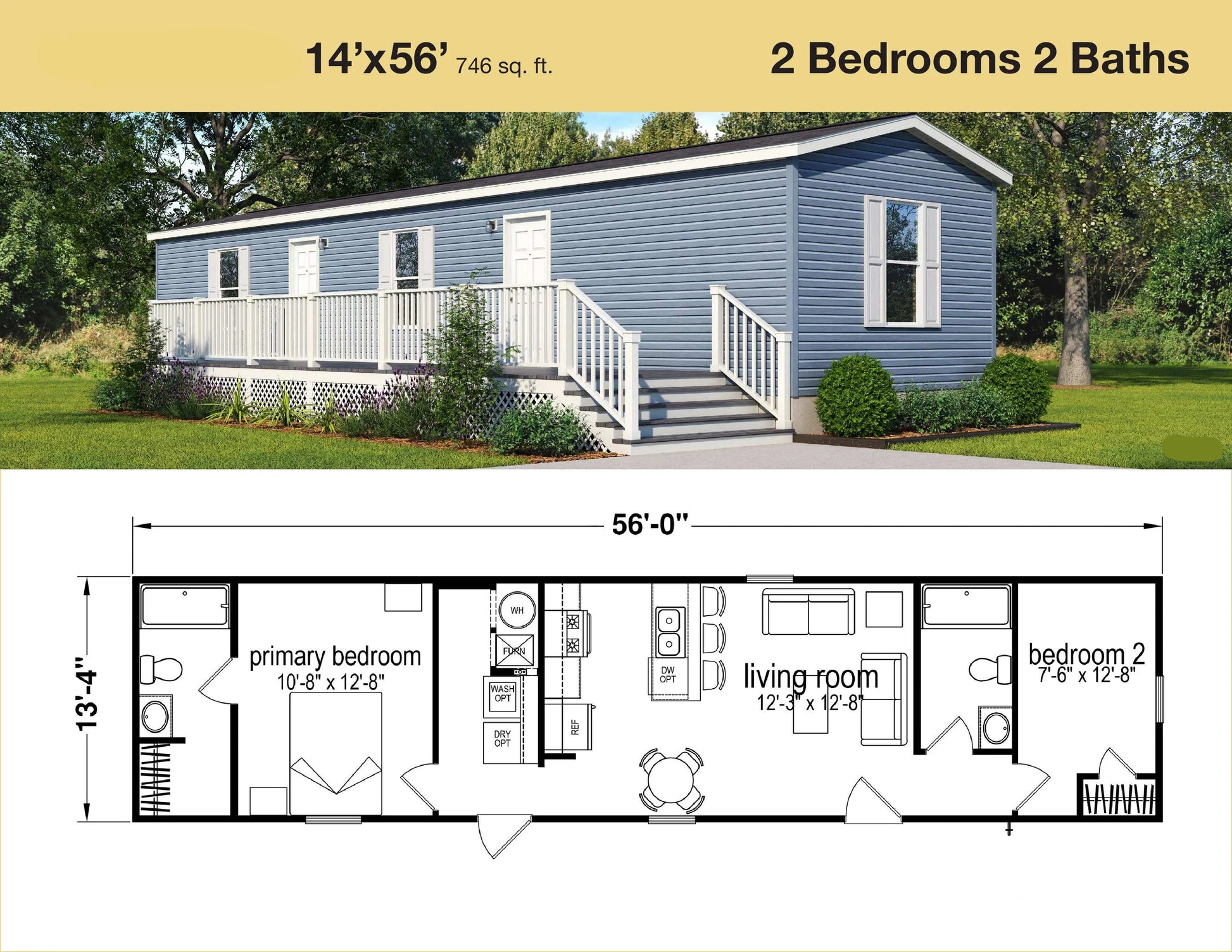 The Snow Top Cabin is a 14' x 56' (746 sq. ft.) cozy modular home featuring 2 bedrooms and 2 bathrooms – with the bedrooms thoughtfully placed on opposite sides for added privacy. The master bedroom even includes a private ensuite bathroom for your comfort.